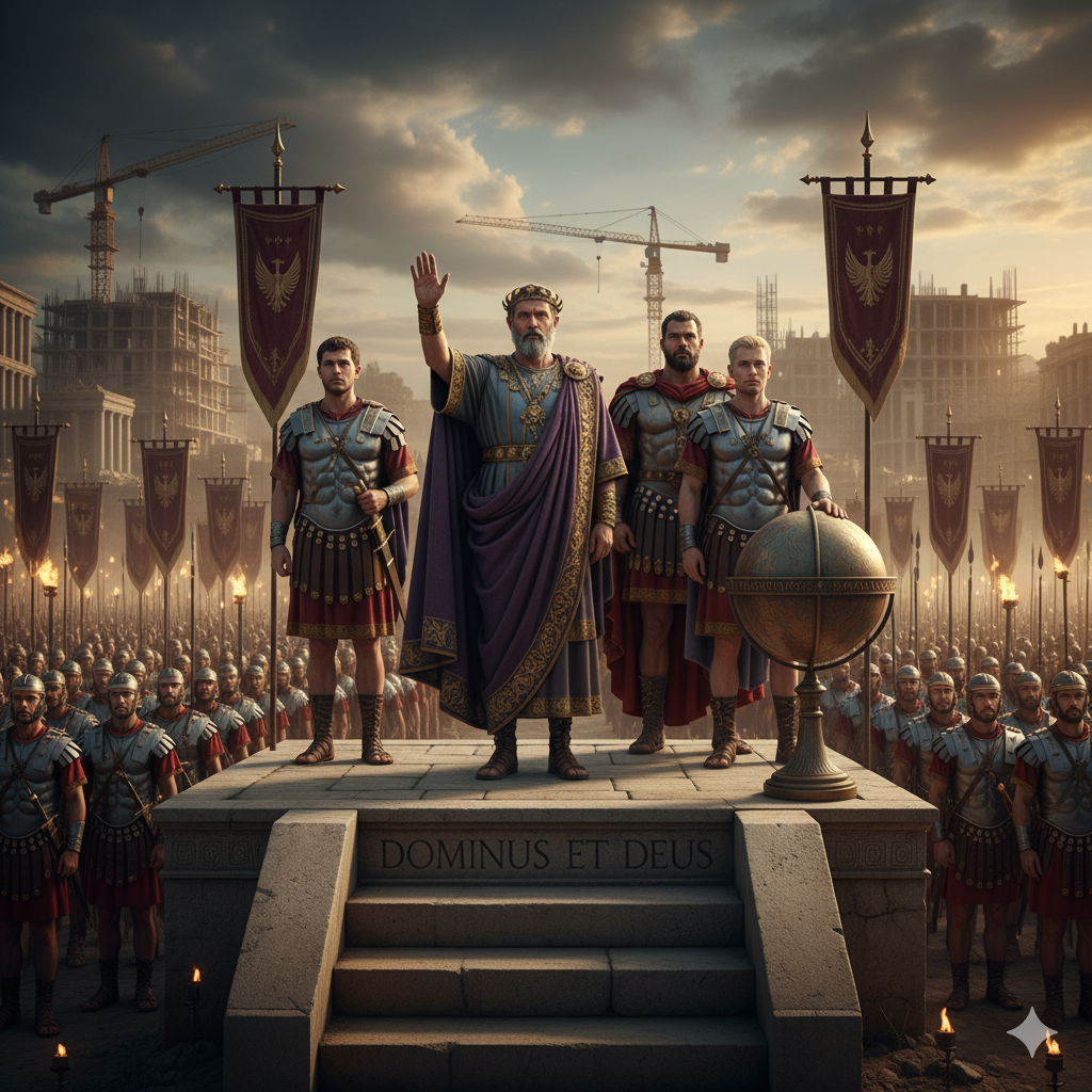 Bu amaçla, imparatorluk makamını tamamen yeniden tasarladı. Kendisine “Dominus et Deus” (Efendi ve Tanrı) unvanını aldı. Artık o, senatörler arasında “eşitlerin birincisi” değil, teokratik ve otokratik bir hükümdardı. Kendisine “Jovius” (Jüpiter’in soyundan gelen) unvanını vererek ilahi bir statü kazandı. Artık imparatorun huzuruna çıkanlar, onun yüzüne bakamıyor, yere kapanarak sadece cüppesinin eteğini öpebiliyordu. Bu, Roma’nın “Dominate” olarak bilinen yeni otokratik çağıydı.